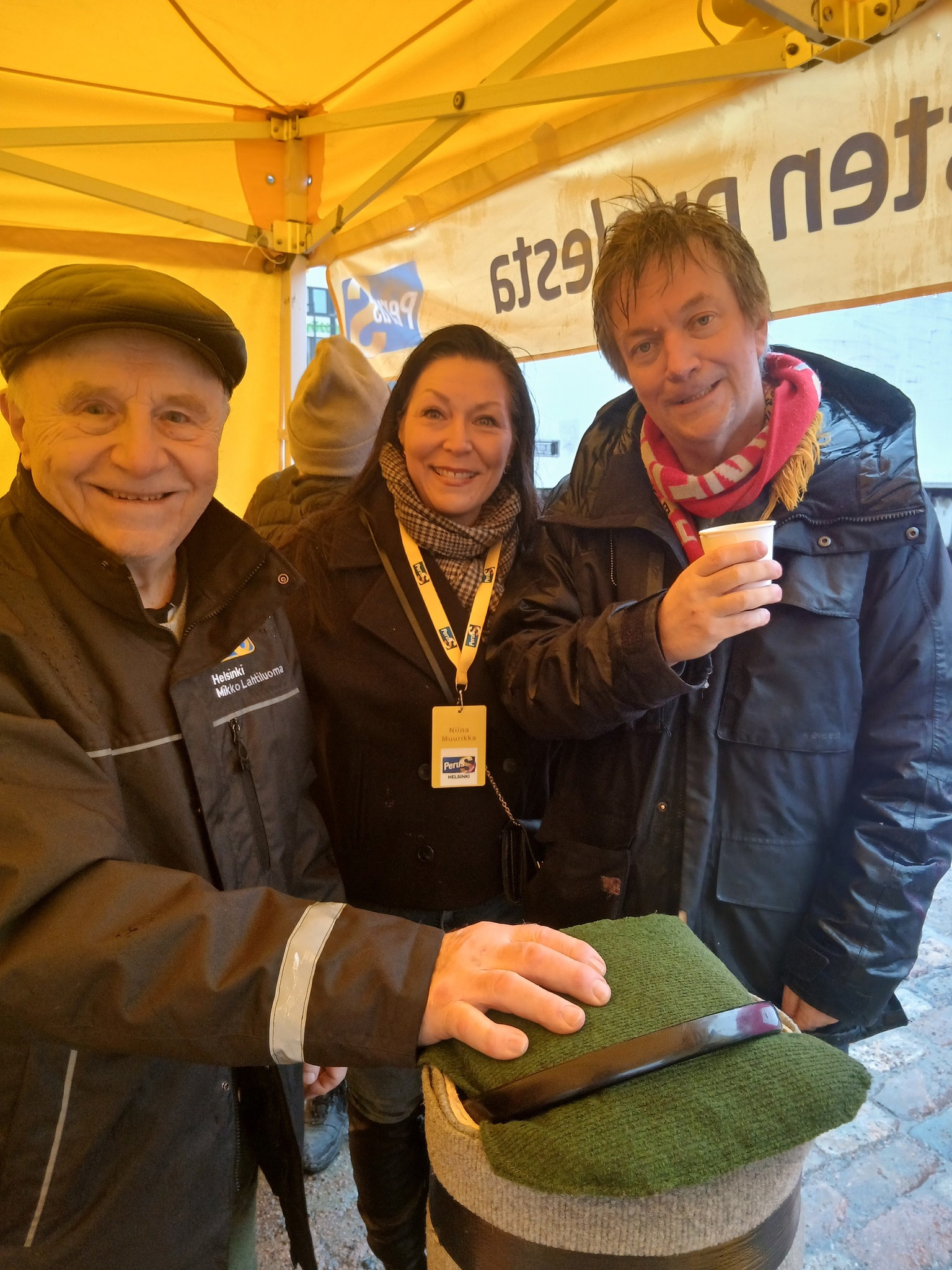 Perussuomalaiset telttailivat sunnuntaina 1.3.2026 Hakaniemen maalaismarkkinoilla. Vieraanamme oli puolueemme 1. varapuheenjohtaja/kansanedustaja Teemu Keskisarja. Kuvassa myös Helsingin alueyhdistyksen pitkän linjan aktiivi Mikko Lahtiluoma – Mikko tarjoilee aina mehua teltallamme, vuosien kokemuksella!